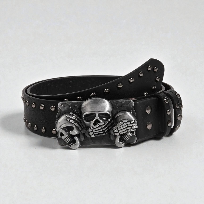 statement belt inspired by the idea of see no evil, hear no evil, speak no evil. Detailed skull buckle and stud accents add character without overpowering the fit.