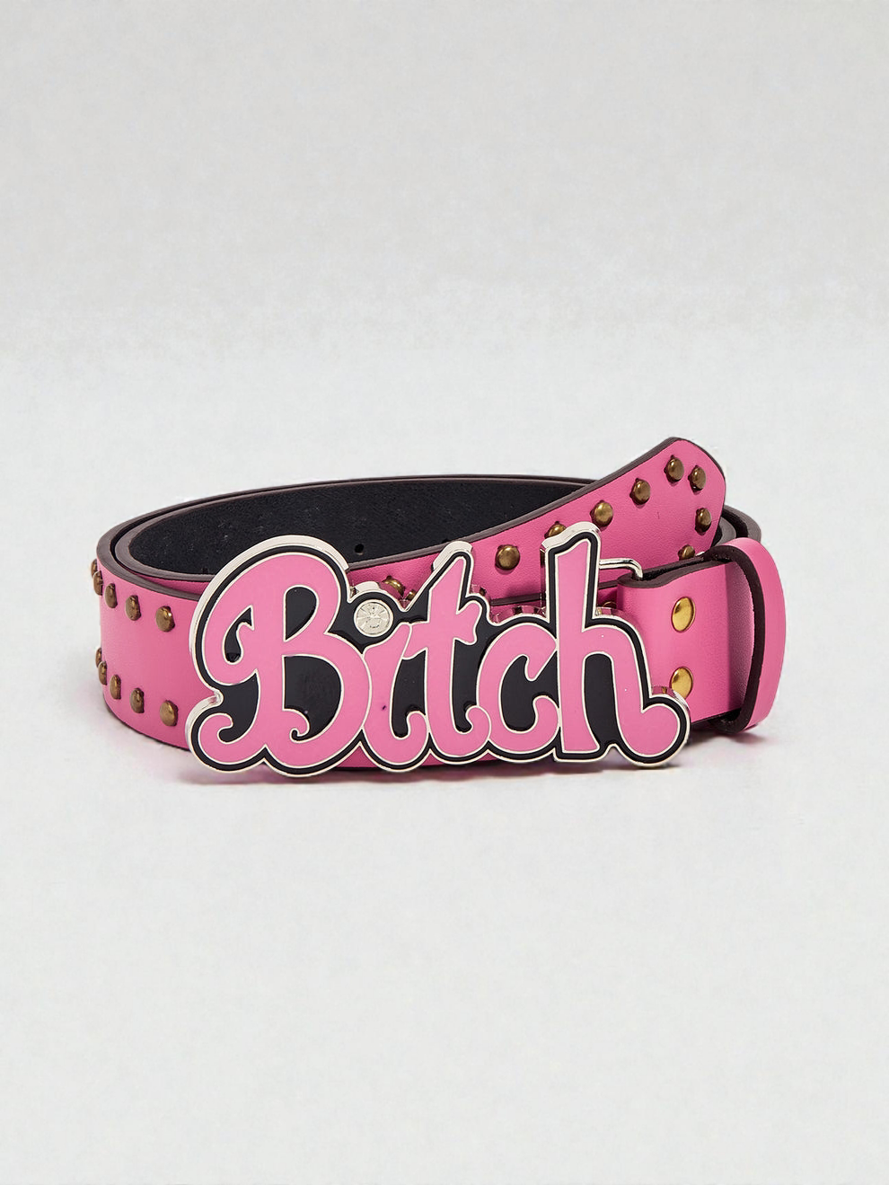 bold pink bitch belt made to elevate outfits. Stud detailing and a statement buckle add instant character.